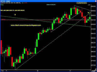 NIFTY DAILY CHART:VOLATILE SESSION: NIFTY HAD GONE UP BY 87 POINTS AT ONE POINT THUS PENETRATING THE LOWER TRENDLINE (GREEN) ,BUT WAS NOT ABLE TO CLOSE ABOVE THE TRENDLINE AND CLOSED AT 5269 (+24)NIFTY HAS STRONG RESISTANCE AT 5344( PURPLE LINE)